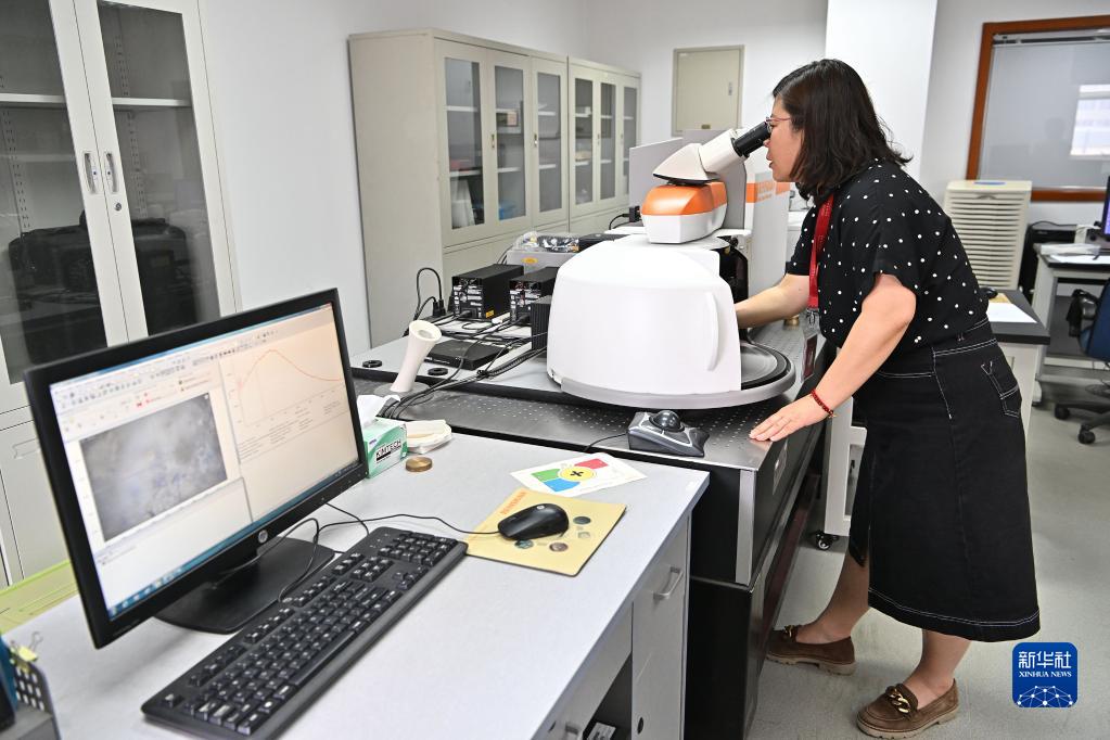 5月16日,国博文保院副院长成小林展示运用显微激光拉曼光谱仪研究圆明园同乐园建筑群样式雷烫样文物的颜料组成。