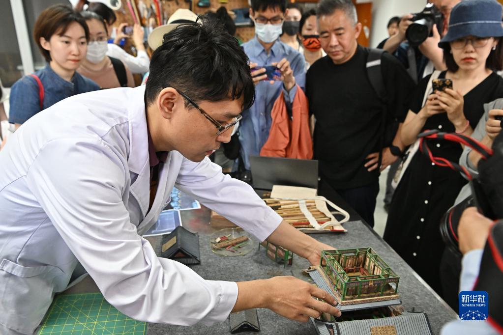 5月16日,国博文保院修复师王熙林(前左)向媒体记者介绍圆明园同乐园建筑群样式雷烫样文物修复情况。