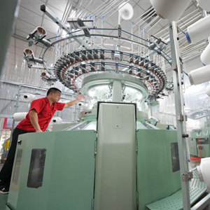 5月15日,在青岛市即墨区即发集团有限公司生产车间,工人在检测纱线张力。