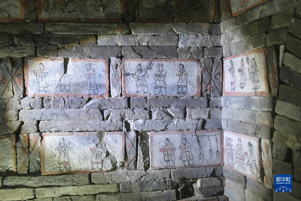 在嘉峪关魏晋墓六号墓的画像砖上,绘有男主人宴请宾客的画面,内容表现了仆人在加工烤肉、蒸食物、端着托盘给主人用餐的场景(5月10日摄)。