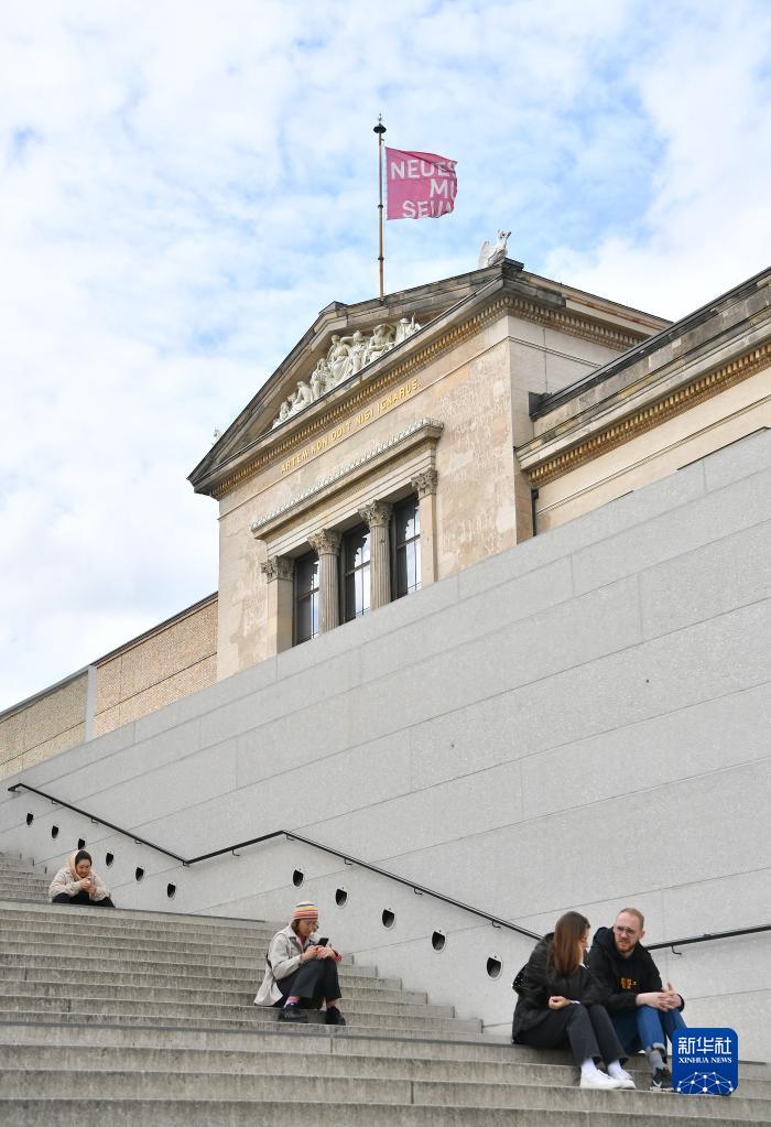 5月16日,在德国柏林博物馆岛,人们坐在新博物馆旁的台阶上休息。
