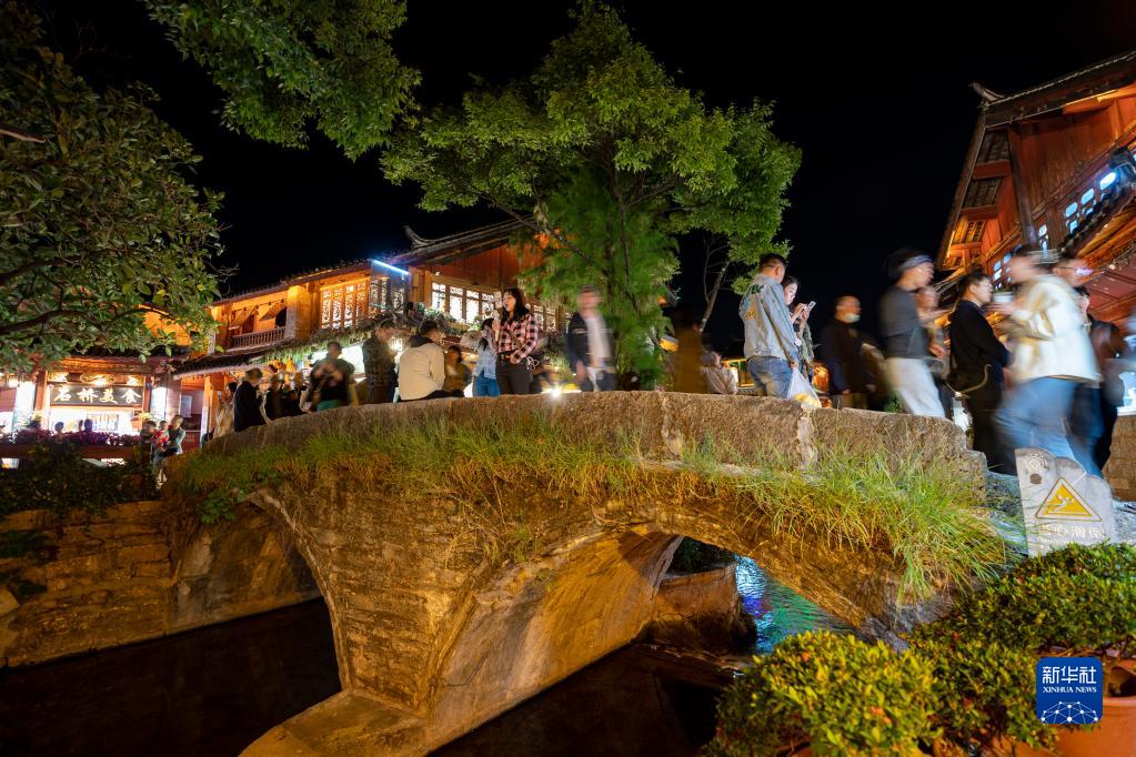 夜幕降临,华灯初上,云南丽江古城内熙熙攘攘,来自各地的游客在这里就餐、购物、休闲娱乐,体验古城“夜经济”。