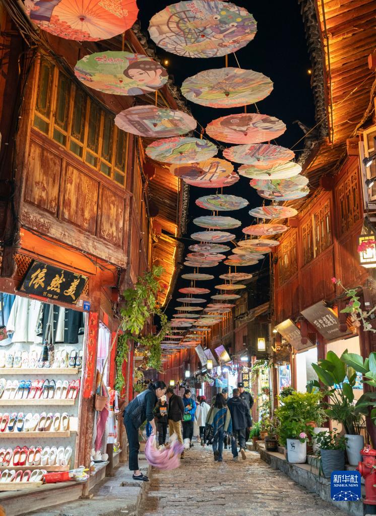 夜幕降临,华灯初上,云南丽江古城内熙熙攘攘,来自各地的游客在这里就餐、购物、休闲娱乐,体验古城“夜经济”。