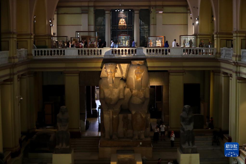 这是5月16日在位于埃及首都开罗的埃及博物馆拍摄的古埃及法老阿蒙霍特普三世和妻子泰伊的巨大石雕坐像。