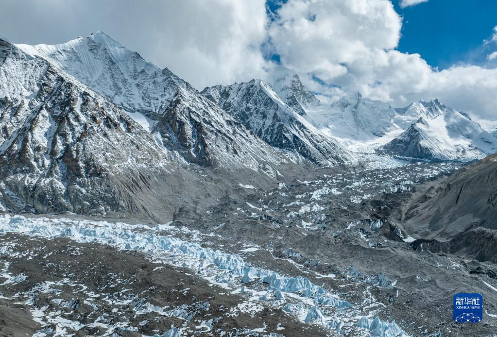 这是珠峰脚下的中绒布冰川(前)和西绒布冰川(后)(5月15日摄,无人机照片)。