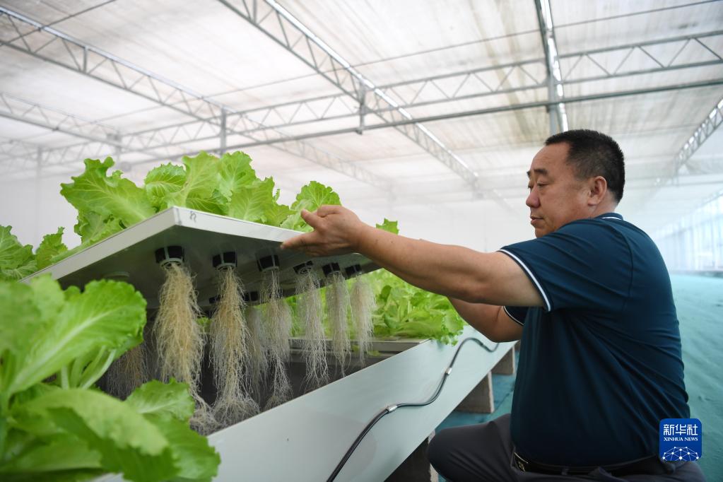 5月17日,饶阳县一处高品质蔬菜产业园的工作人员在设施温室查看水培蔬菜生长情况。