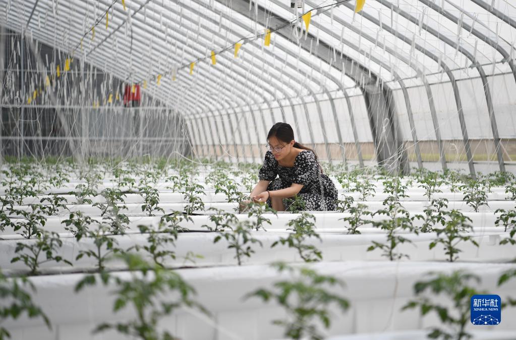 5月17日,饶阳县大尹村镇万亩蔬菜标准化种植基地工作人员在设施温棚查看西红柿苗生长情况。