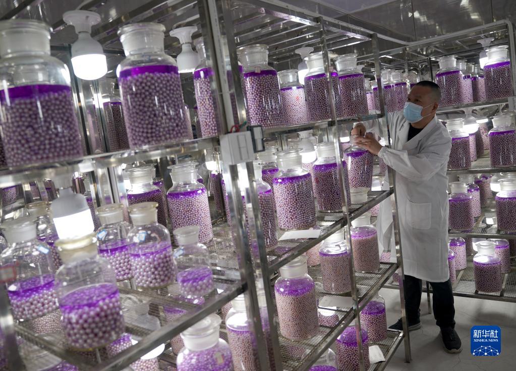 5月17日,浙江省诸暨市山下湖镇一家珍珠企业的工作人员查看库房内进行增亮处理的珍珠。