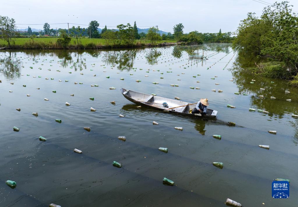 在浙江省诸暨市山下湖镇一处珍珠生产基地,珠农查看珍珠生长情况(5月16日摄,无人机照片)。