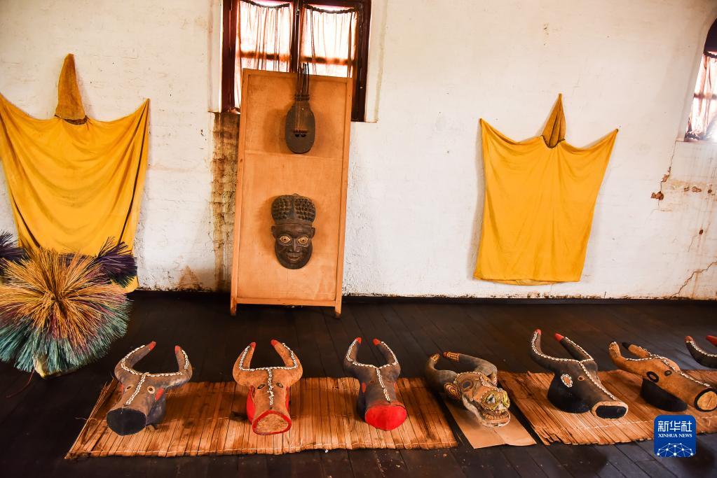 这是4月12日在喀麦隆西部大区丰班拍摄的巴蒙王宫博物馆内展示的面具和服装。