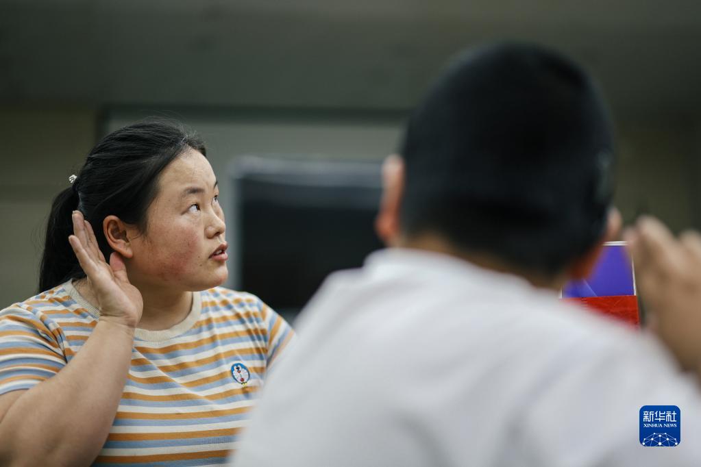 在吉林长春,一名家长在孩子人工耳蜗首次开机调试时将手放在耳朵边,向孩子示意“是否能够听到声音?”(5月15日摄)。