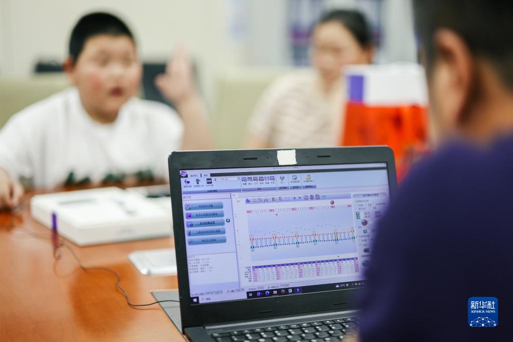 在吉林长春,一名小朋友在人工耳蜗首次开机调试时,举手示意听到了声音(5月15日摄)。