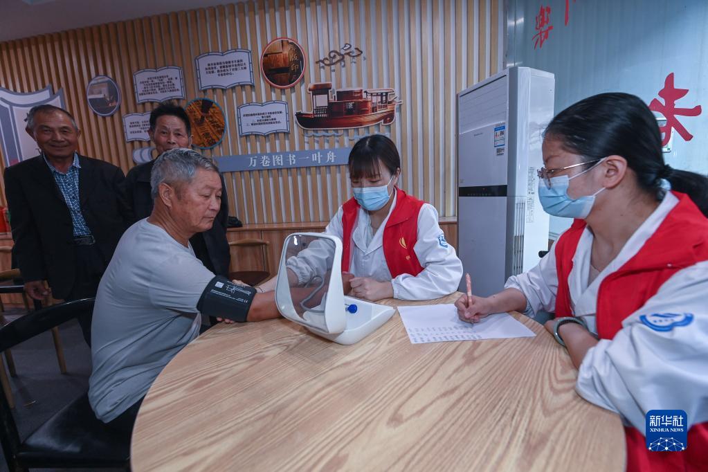 5月18日,志愿者在织里镇晟舍村居家养老服务中心为老人进行健康体检。