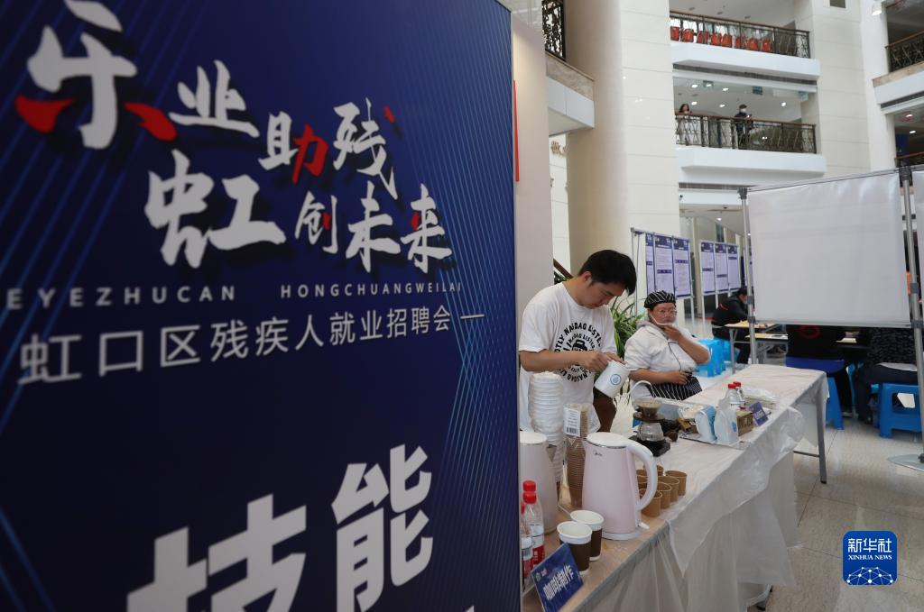 5月18日,参加招聘会现场技能展示的残疾人代表在进行手冲咖啡展示。