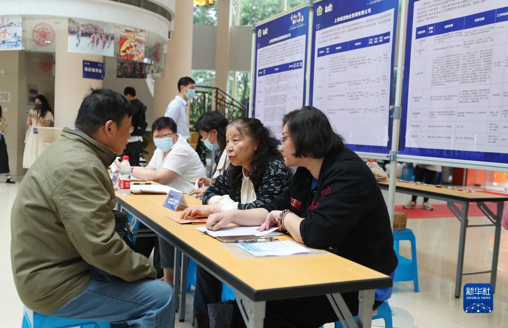 5月18日,招聘企业工作人员(右)在招聘会现场与求职者交流。