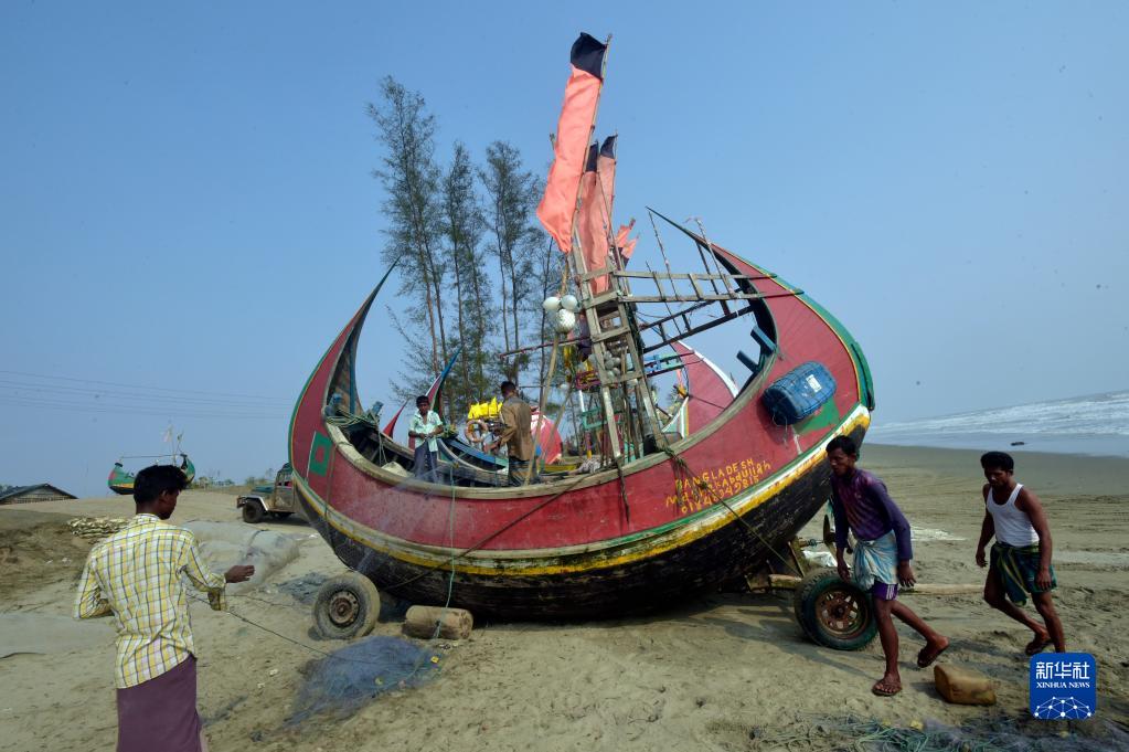 5月15日,在孟加拉国南部科克斯巴扎尔,热带气旋“穆查”经过之后,渔民回到海滩上整理渔船为出海捕鱼做准备。