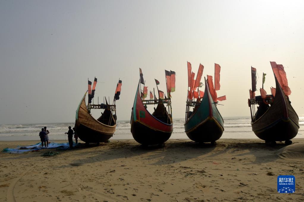 5月15日,在孟加拉国南部科克斯巴扎尔,热带气旋“穆查”经过之后,渔民回到海滩上整理渔船为出海捕鱼做准备。