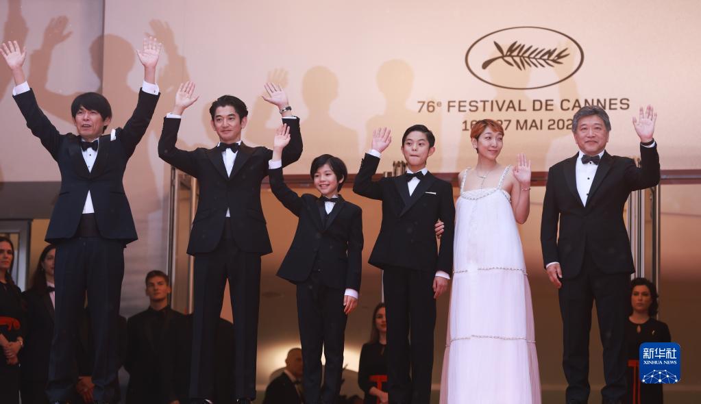 5月17日,在法国戛纳举行的第76届戛纳国际电影节上,日本导演是枝裕和(右一)携主创人员亮相日本影片《怪物》首映礼红毯。