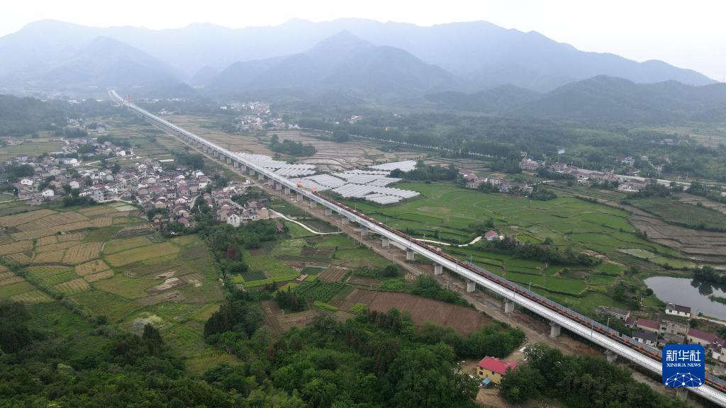 当日,在中铁十一局池(州)黄(山)铁路铺轨施工现场,一对500米长钢轨铺设在无砟轨道板上,这标志着池黄铁路全线开始铺轨。池黄铁路全长约125公里,设计时速350公里,是武(汉)杭(州)快速铁路通道的重要组成部分。