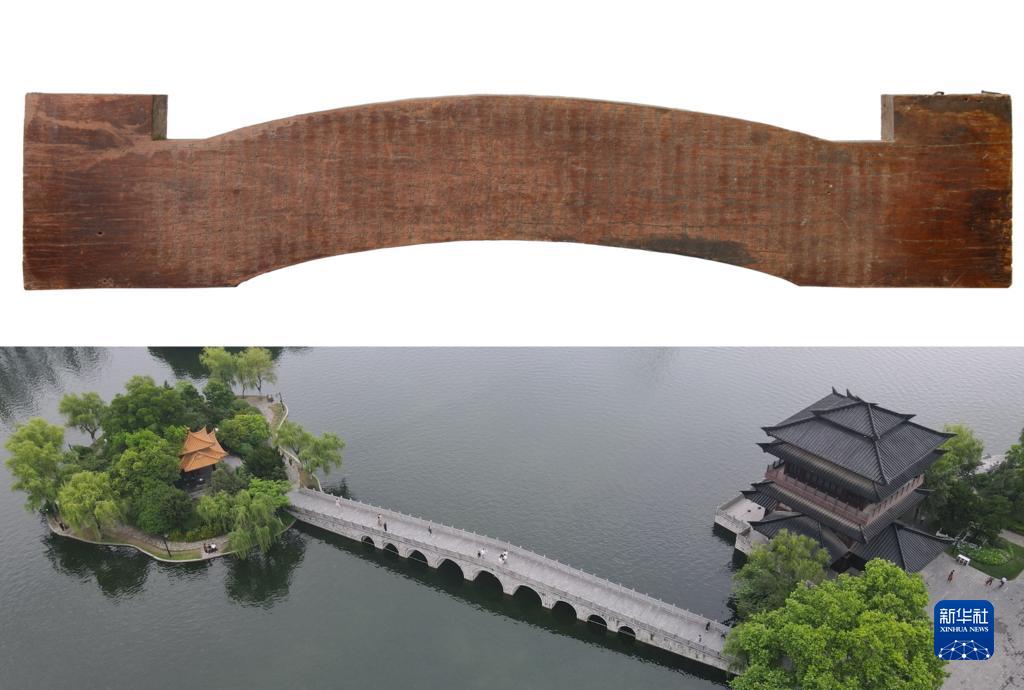 这是一张拼版照片,上图为:《逍遥津木刻枋》,现收藏于安徽博物院(新华社发,吴艳摄);下图为:5月17日拍摄的位于安徽省合肥市的逍遥津公园(无人机照片,新华社记者张端摄)。