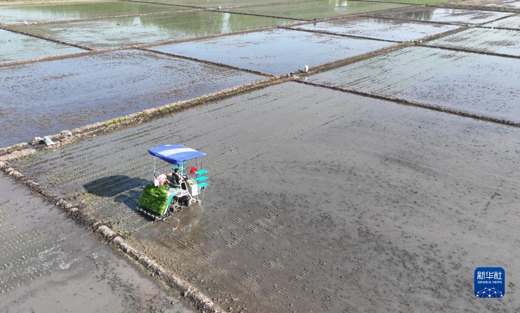 5月18日,河北唐山丰南区岔河镇杨义口头一村农民在水稻田使用农机插秧(无人机照片)。