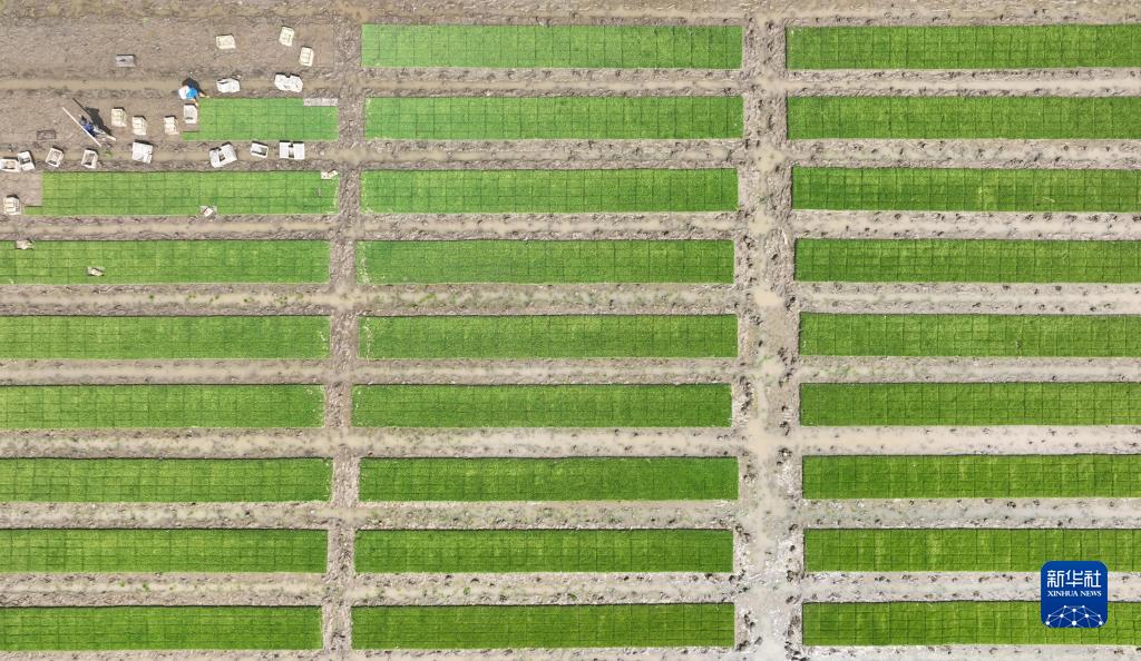 5月18日,河北唐山丰南区岔河镇杨义口头一村农民在水稻秧苗田起秧(无人机照片)。