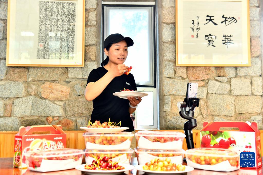 5月18日,在泰安市徂汶景区天宝镇年家峪村,一位果农在直播推介樱桃。