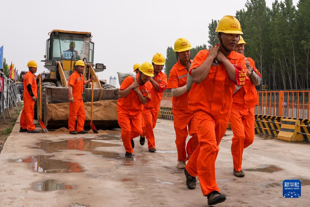 5月18日,参加演练的中铁四局施工人员在现场抢运沙袋。