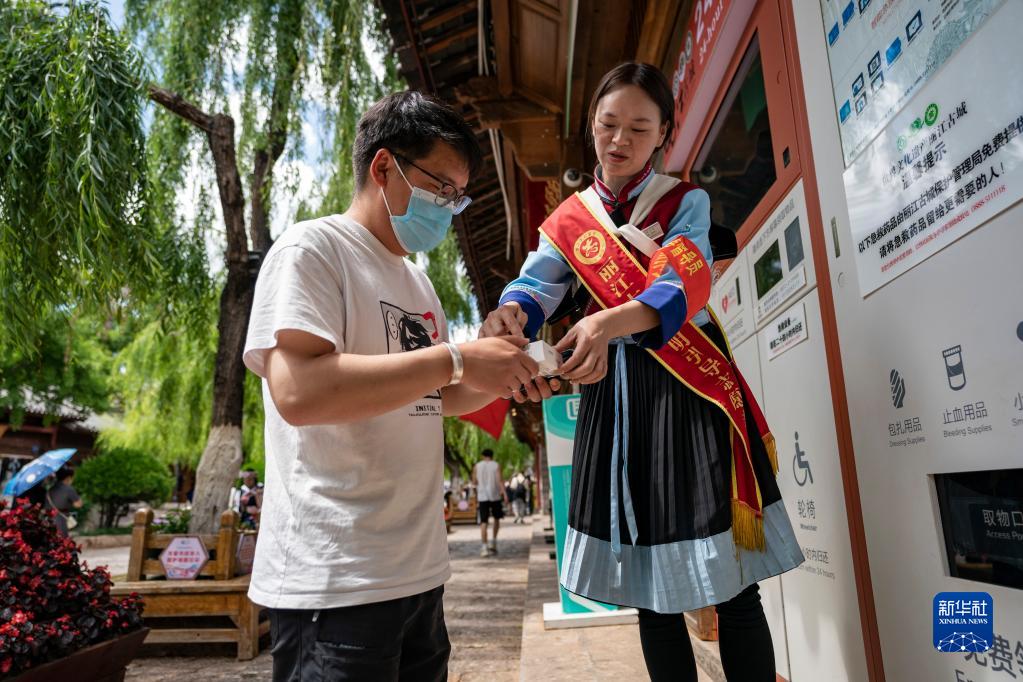 5月18日,一名志愿者(右)在丽江古城帮助游客通过24小时智能急救站领取小伤口处理用品。