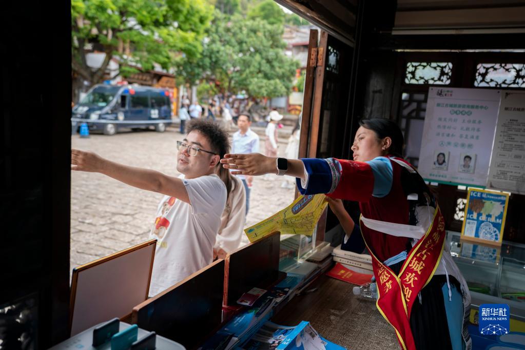 5月18日,一名志愿者(右)在丽江古城一处旅游综合服务亭为游客指路。