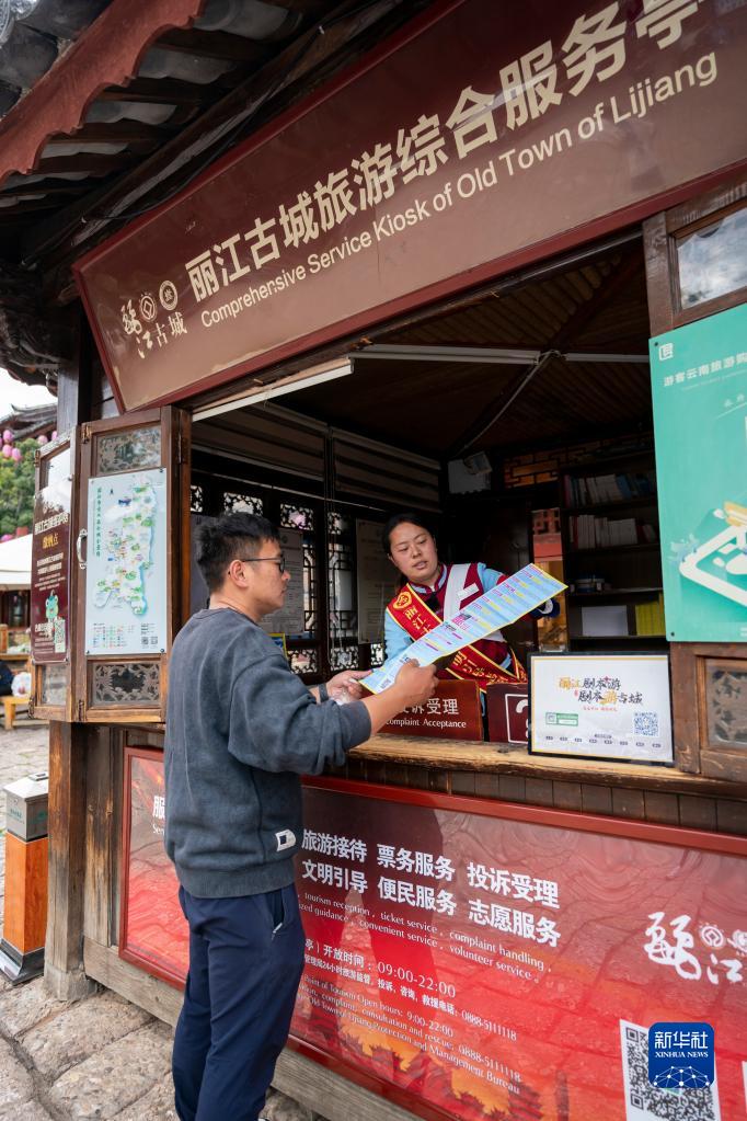 5月18日,一名志愿者(右)在丽江古城一处旅游综合服务亭为游客提供旅游咨询。