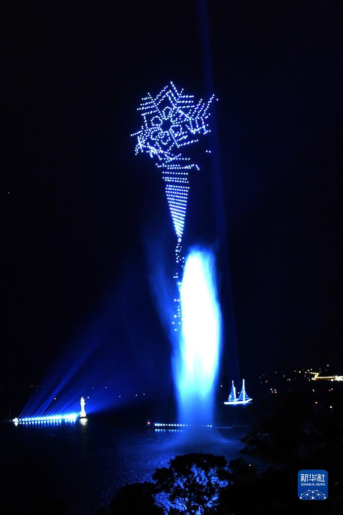 当晚,无人机光影音乐秀在瑞士日内瓦湖上举行,超过1350架无人机点亮夜空,吸引市民驻足观看。