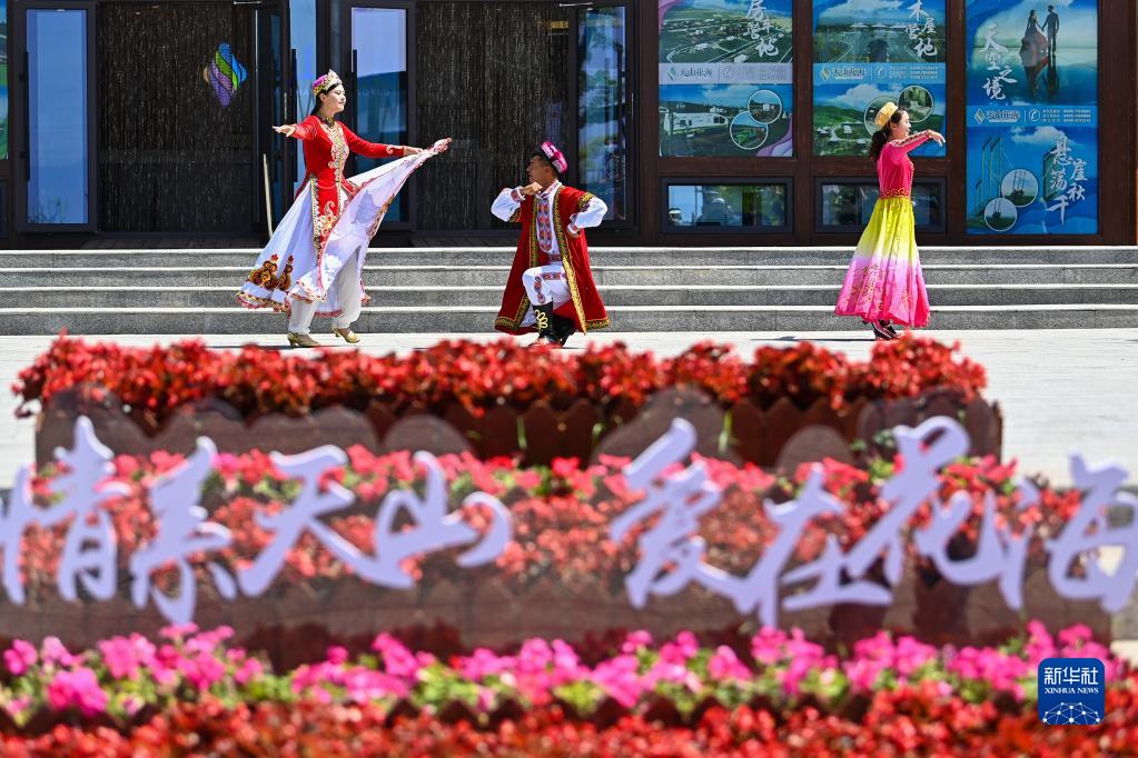 工作人员在新疆伊犁哈萨克自治州伊宁县天山花海国家农业产业园跳起舞蹈欢迎远方来客(5月18日摄)。