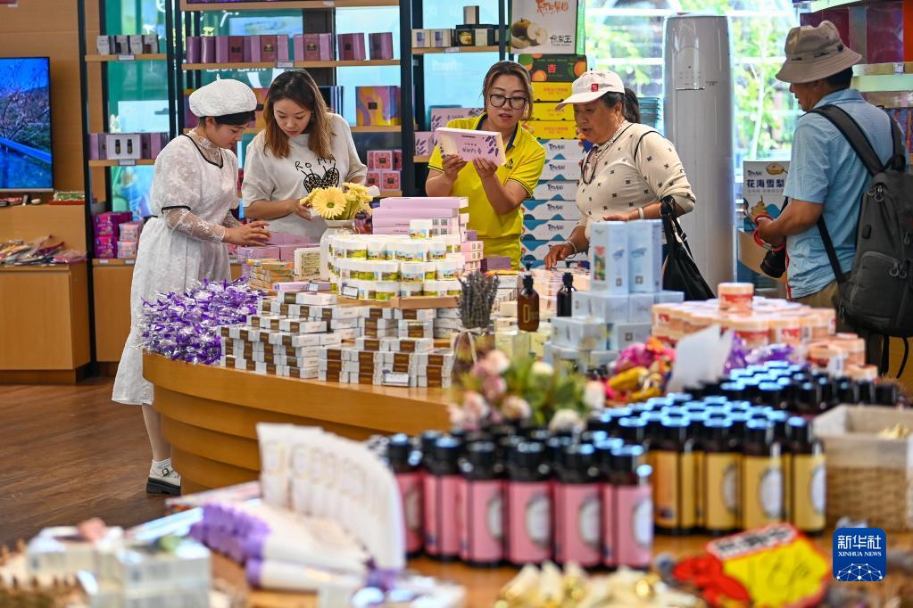 游客在新疆伊犁哈萨克自治州伊宁县天山花海国家农业产业园服务中心选购特色产品(5月18日摄)。