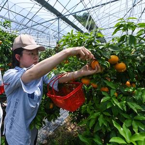 5月19日,游客在建德柑橘科技小院基地大棚内采摘柑橘。