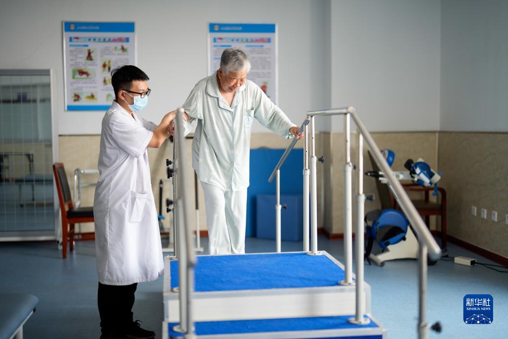 5月19日,河北省滦南县一家养老机构的工作人员在指导老人进行康复训练。