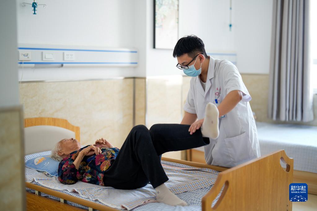 5月19日,河北省滦南县一家养老机构的工作人员在指导老人进行康复训练。