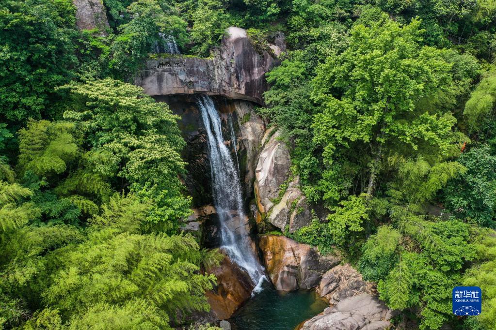 5月16日在浙江省台州市天台县天台山风景旅游区拍摄的石梁飞瀑一景(无人机照片)。石梁飞瀑景点有一条巨大石梁横跨在两崖之间,瀑布水流从梁底穿过,坠入幽谷之中。徐霞客在游记中写道:“下瞰深潭,毛骨俱悚。”