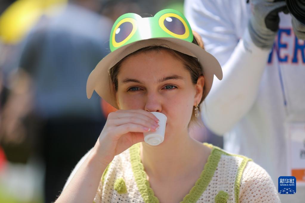 5月19日,游客在韩国首尔广场品尝中国茶。
