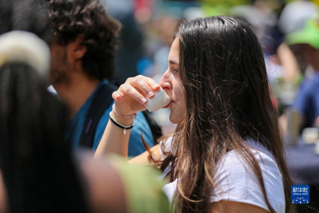 5月19日,游客在韩国首尔广场品尝中国茶。