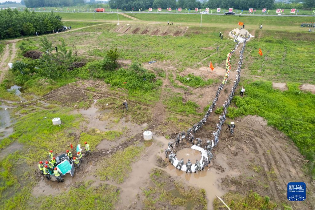 5月19日,在洞庭湖区防汛抢险应急救援演练中,参演人员演练处置管涌险情(无人机照片)。