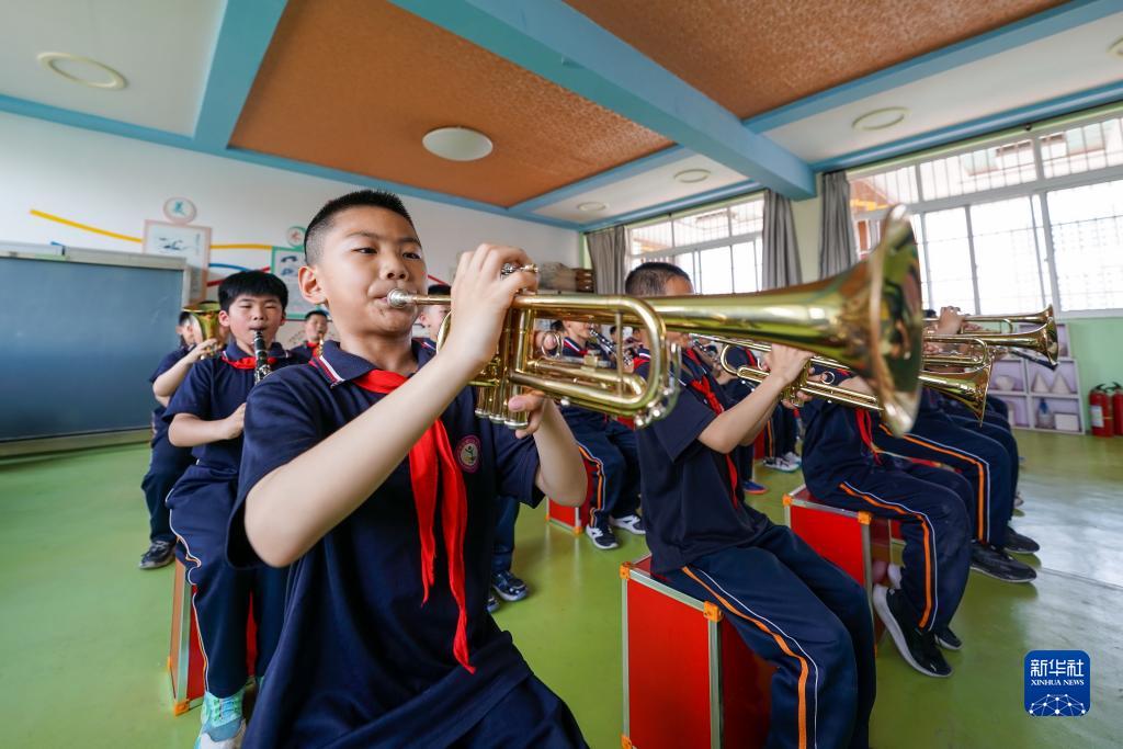 5月19日,河北省滦南县第一实验小学铜管乐器社团的学生在排练。