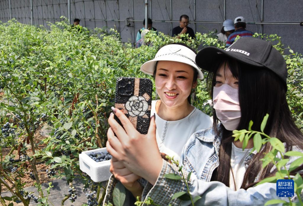 5月19日,游客在宝山镇一家蓝莓专业合作社蓝莓采摘大棚内拍摄。