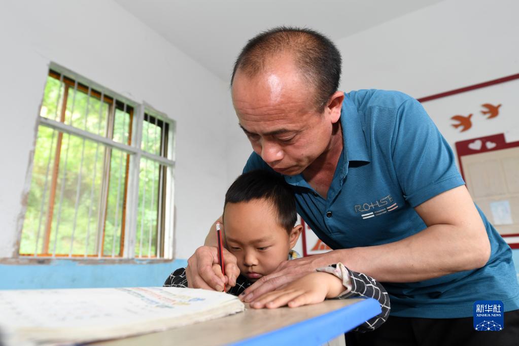 5月19日,在广西灵川县大境瑶族乡金竹教学点,李忠华教一名学生写字。