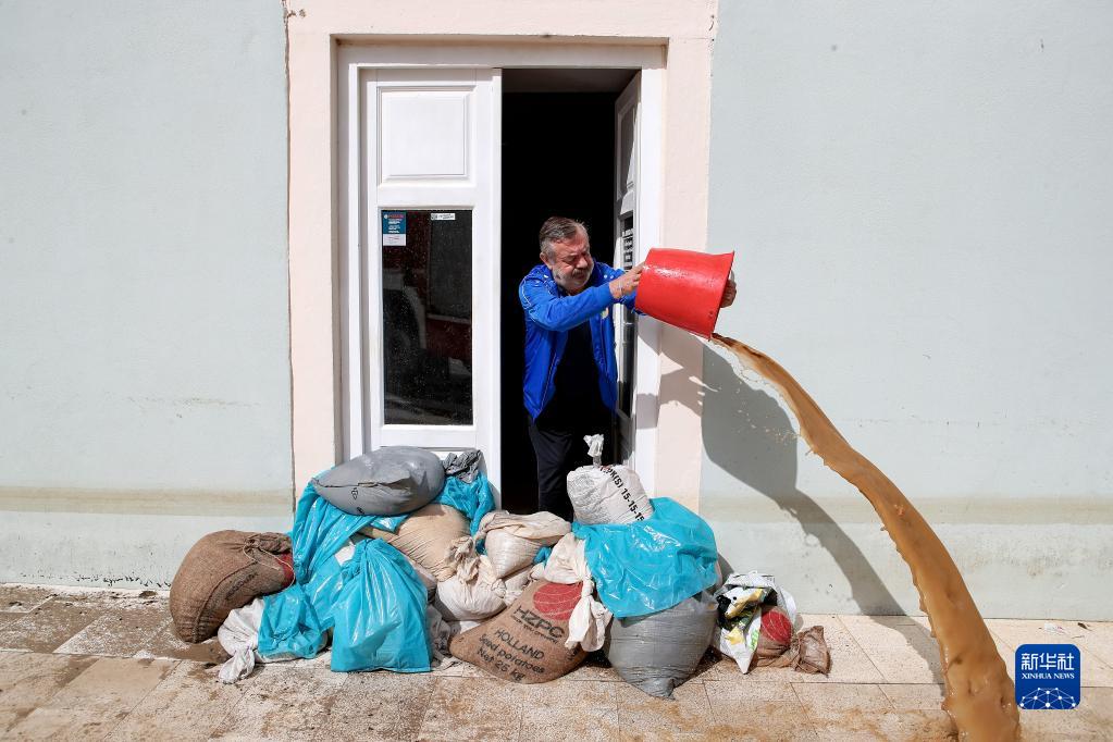 5月16日,在克罗地亚奥布罗瓦茨,一名男子清理进水的房屋。