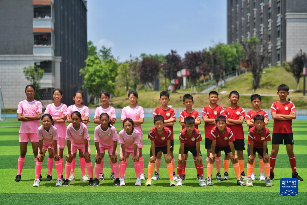 来自凉山彝族自治州的19名小球员在泸州天立春雨学校足球场留影(5月12日摄)。
