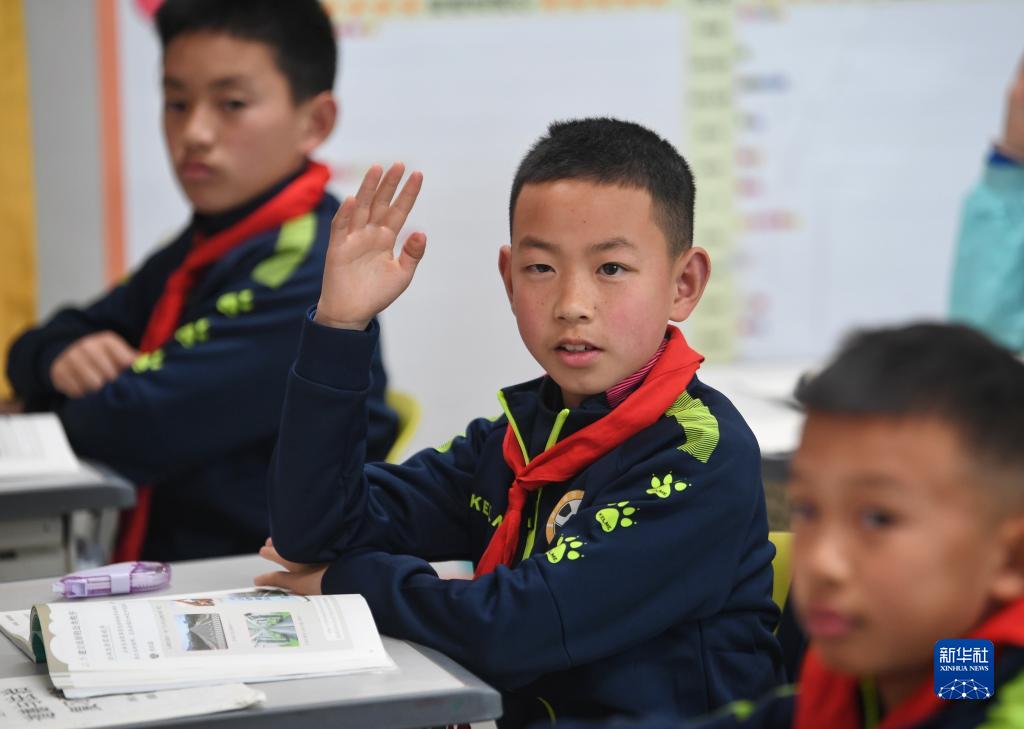 在泸州天立春雨学校教室,来自凉山彝族自治州的金贵坤(中)在课堂上举手回答老师提问(3月28日摄)。