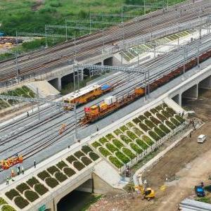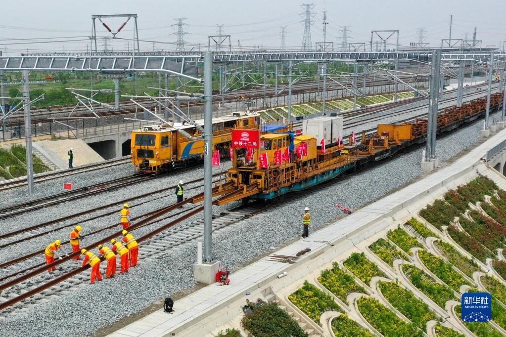 5月20日,在沪宁沿江高铁太仓站施工现场,中铁十二局的工程人员利用机械将钢轨放入承轨槽(无人机照片)。