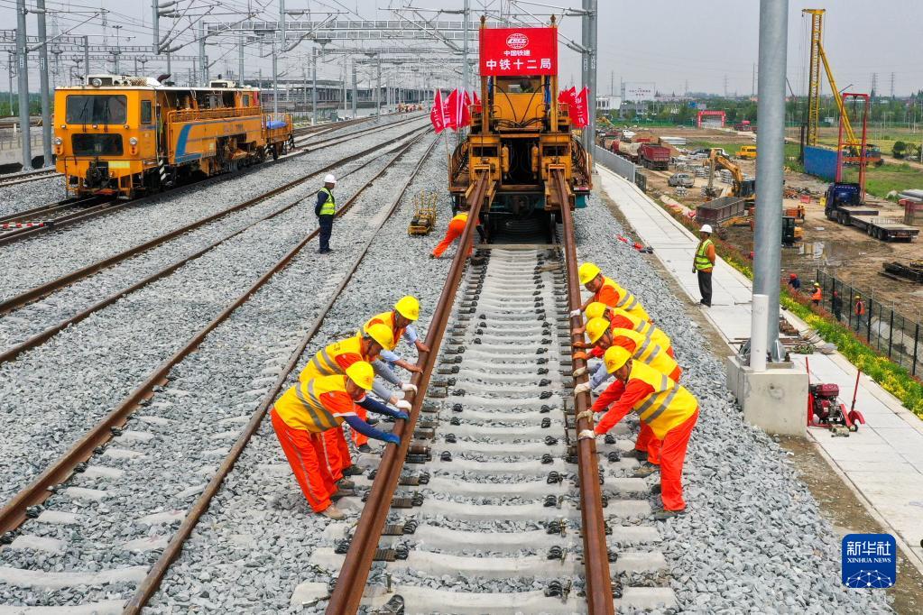 5月20日,在沪宁沿江高铁太仓站施工现场,中铁十二局的工程人员利用机械将钢轨放入承轨槽(无人机照片)。