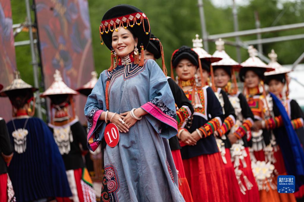5月20日,彝族姑娘展示传统服饰。
